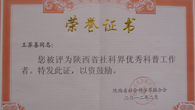 我部王苏喜教授因其多年来在哲学社会科学方面的研究与宣传普及工作,被评为“陕西省社科界优秀科普工作者”,受到大会隆重表彰。
