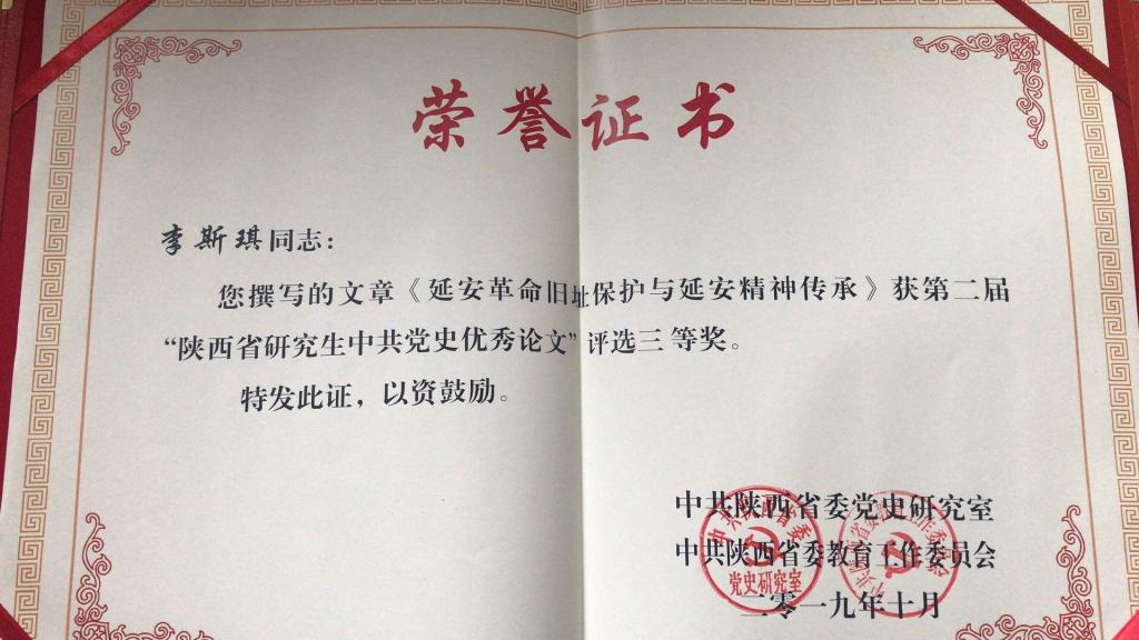 2019年11月5日,在中共陕西省委党史研究室举办的“第二届陕西省研究生中共党史优秀论文颁奖暨学习党史、新中国史研讨会”上,新加坡博彩网站 17级硕士生李思琪同学提交的论文《延安革命旧址保护于延安精神传承》获得第二届“陕西省研究生中共党史优秀论文”三等奖。