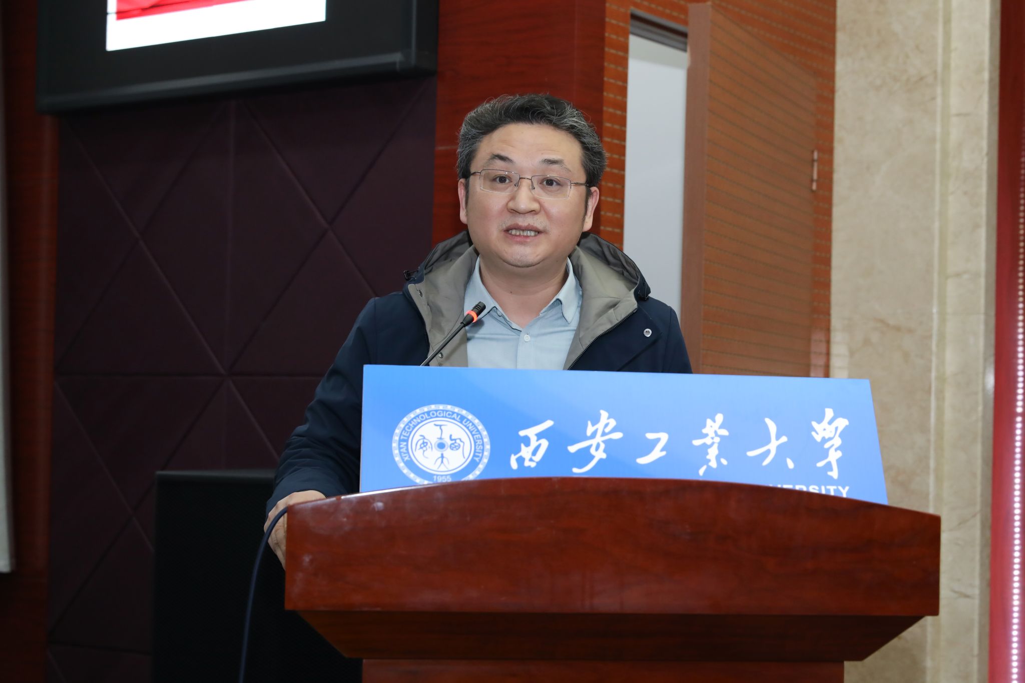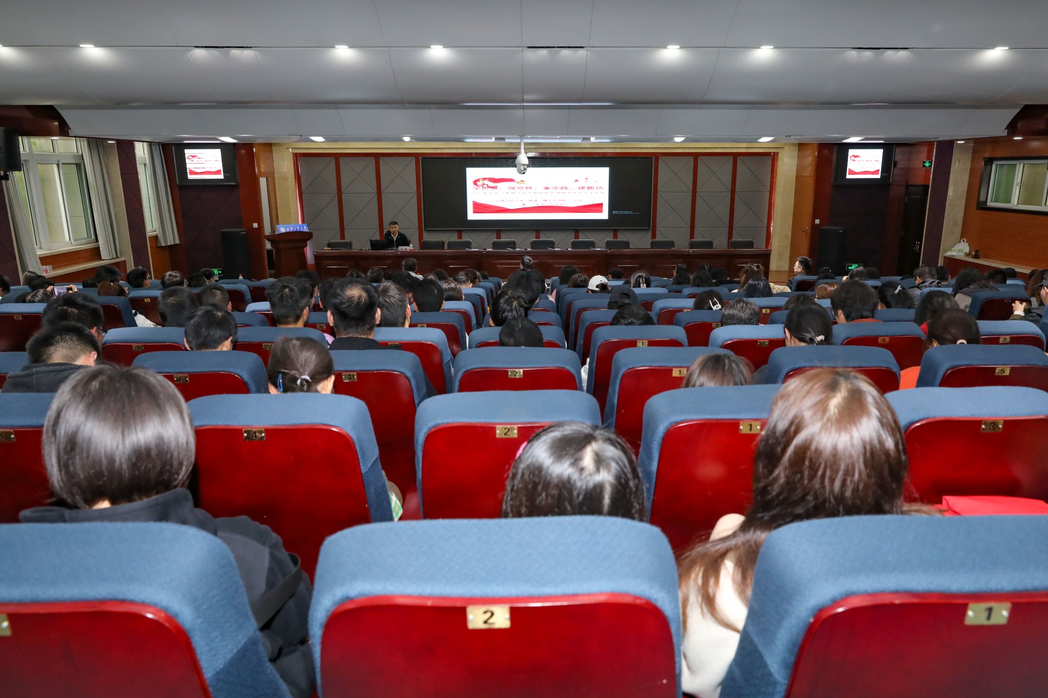 王东教授为师生们开展了题为“学思想、强党性、重实践、建新功”——深入学习贯彻习近平新时代中国特色社会主义思想的专题讲座。本次讲座由西安工业大学党委委员、副校长陈建主持,新加坡博彩app
