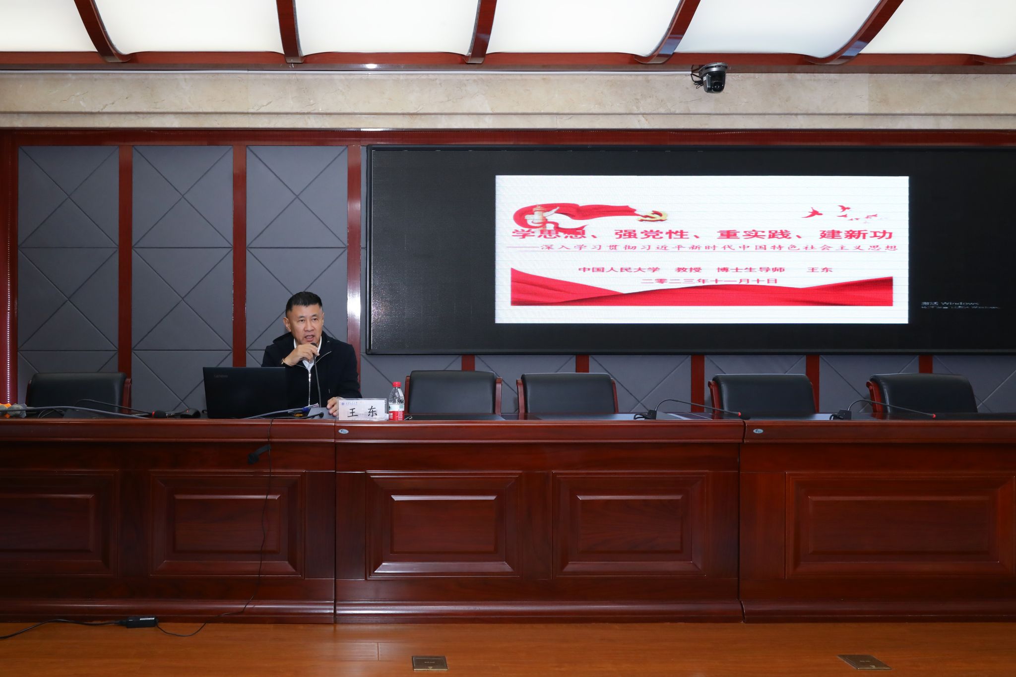 王东教授用通俗易懂、生动形象的语言紧紧围绕学习贯彻习近平新时代中国特色社会主义思想的重大意义,以中国共产党百年奋斗历程和重大贡献切题,从习近平新时代中国特色社会主义思想是党和国家必须长期坚持的指导思想,习近平新时代中国特色社会主义思想的科学体系,知行统一、在学习中增强党性、深刻理解等三个方面进行了详细解读,为师生深入学习领会、准确把握习近平新时代中国特色社会主义思想具有重要指导作用。