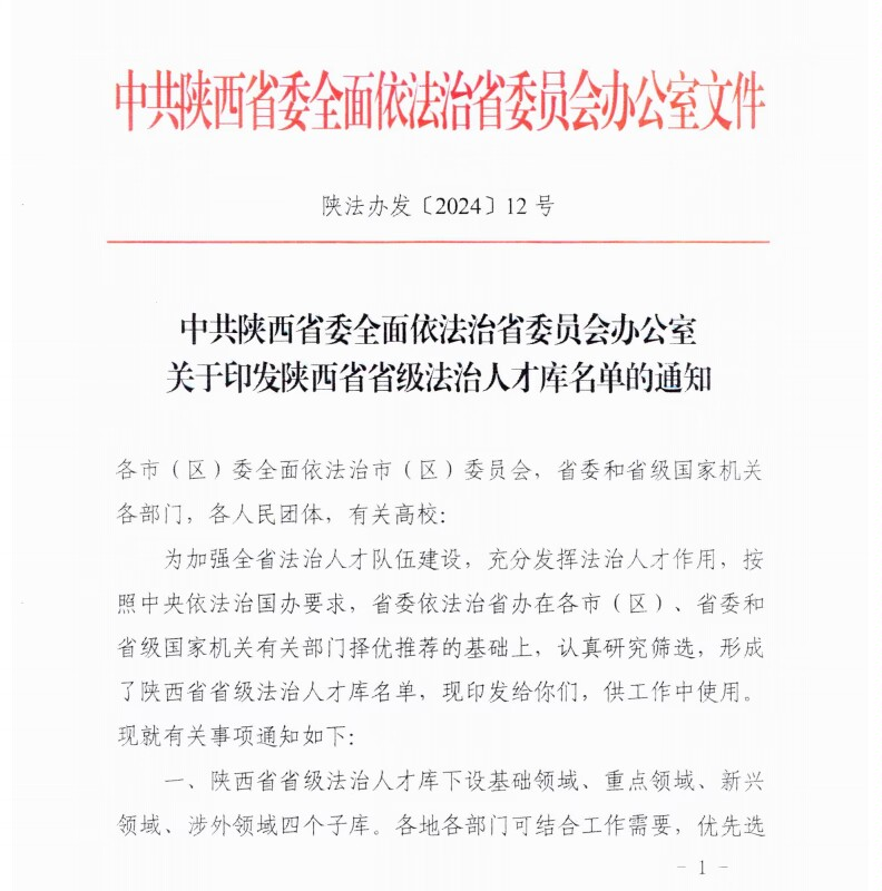近日,中共陕西省委全面依法治省委员会办公室印发了《关于陕西省省级法治人才库名单的通知》(陕法办发〔2024〕12号),新加坡博彩网站