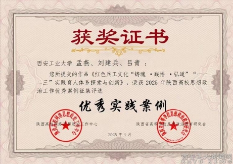 孟燕老师牵头申报的《红色兵工文化“铸魂·践悟·弘道”“一一二三”实践育人体系探索与创新》被评为“优秀实践案例”。该案例以习近平新时代中国特色社会主义思想为引领,以培育新时代具备兵工品格的青年马克思主义者为目标,深挖红色兵工革命精神,以“中国的保尔·柯察金”吴运铎、“工人发明家”倪志福、新时代“最美铁路人”单杏花等红色兵工英模、先进人物为榜样,将思政小课堂和社会大课堂联动同行,构建了“红色兵工文化育人大课堂”,实现思政育人文化创新、思政实践教学创新的红色兵工文化创新实践育人体系。