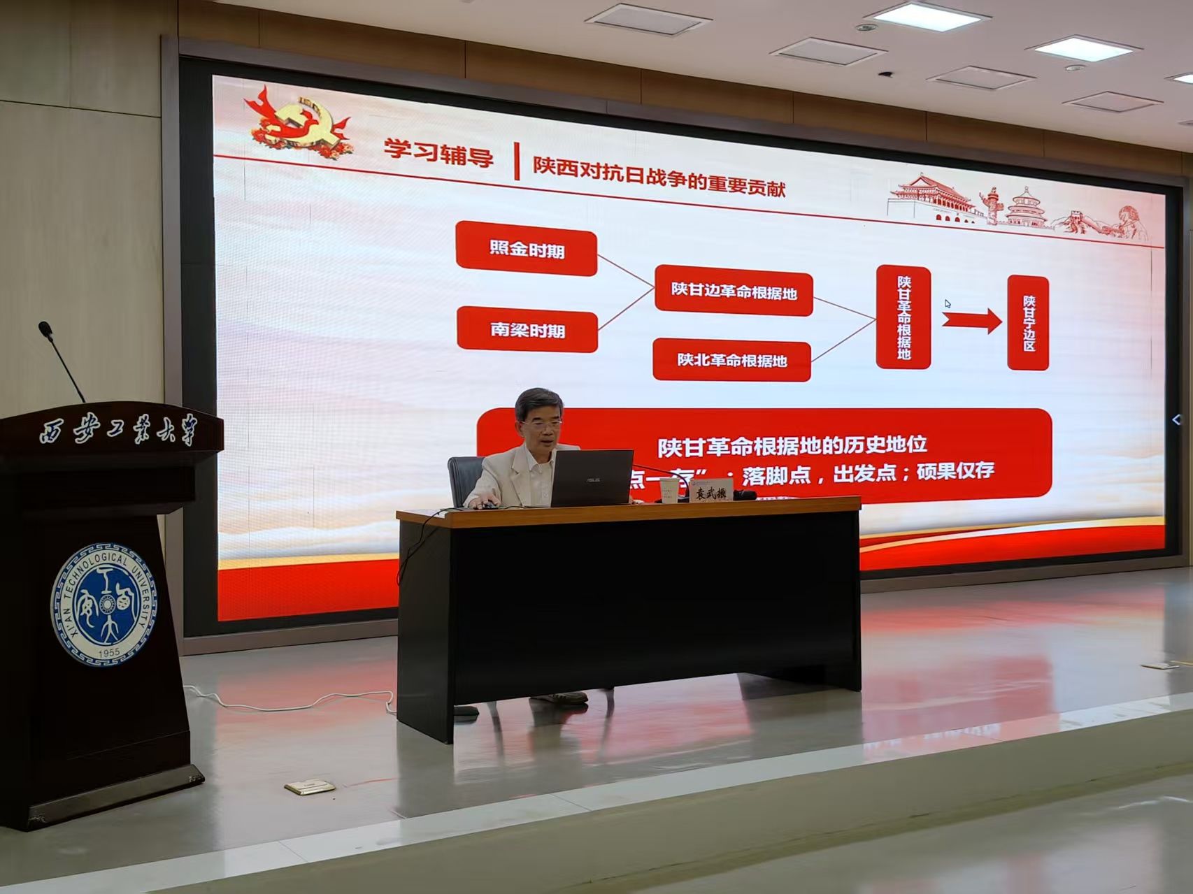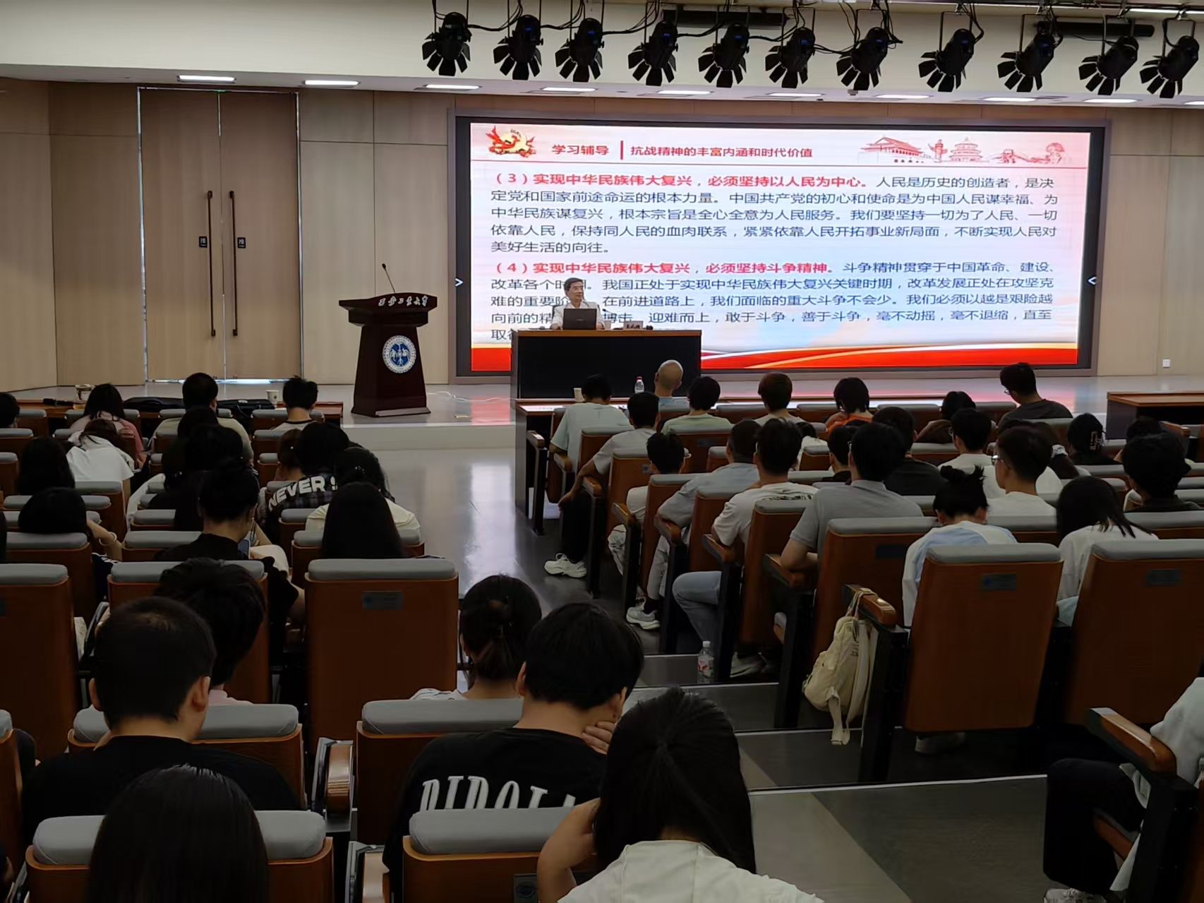 袁武振以“铭记抗战历史 弘扬抗战精神”为主题,从对抗日战争的总体认识、陕西对抗日战争的重要贡献等方面,讲述了中国人民抗日战争的基本历史脉络、陕西军民的抗战贡献,并阐释了抗战精神的丰富内涵及时代价值。袁武振号召同学们从抗战历史和抗战精神中汲取智慧和力量,将伟大抗战精神转化为实现强国伟业、复兴大业的强大动力。