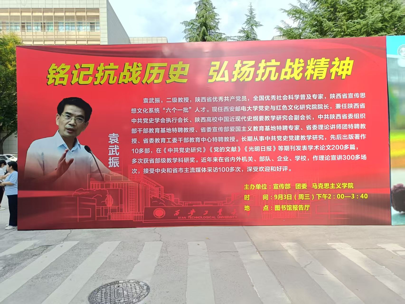 联合党委宣传部、团委隆重举行纪念活动,邀请西安邮电大学党史与红色文化研究院院长袁武振教授来我校做专题报告,以铭记历史、缅怀先烈,弘扬伟大爱国主义精神、伟大抗战精神。