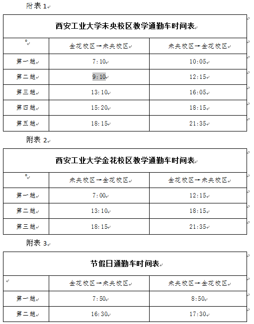 本学期学校对作息时间及通勤车发车时间进行了调整,经试运行一个月,学校跟踪发现,受西安市取消机动车限行规定等因素的影响,部分通勤车班次运行时间较为紧张。为保证学校教学运行各项工作正常开展,现将通勤车部分班次发车时间进行调整。调整后的发车时间见附表1、表2、表3,发车地点不变。新的发车时间从2018年4月2日(周一)起开始执行。请各单位(部门)及时传达,确保教职员工能按时乘车。