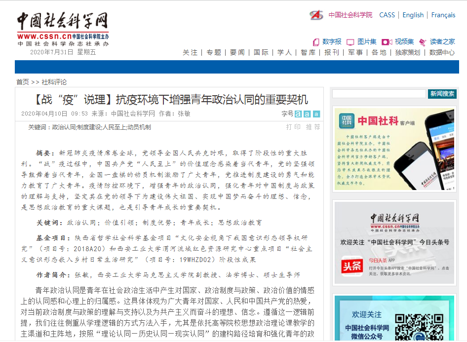 张敏副教授《抗疫环境下增强青年政治认同的重要契机》一文2020年4月10日发表在中国社会科学网,文章结合当前新冠肺炎疫情席卷全球的现实,分析疫情期间中国共产党以人民为中心的崇高价值贯穿始终,感染和激励着广大青年。在疫情防控环境下,要切实增强青年的政治认同,强化青年对中国政治制度与党和政府政策的理解与支持,坚定其在党的领导下为建设伟大祖国,实现中国梦而奋斗的理想、信念,是思想政治教育实践的一项重大课题,也是切实引导青年成长的重要契机。