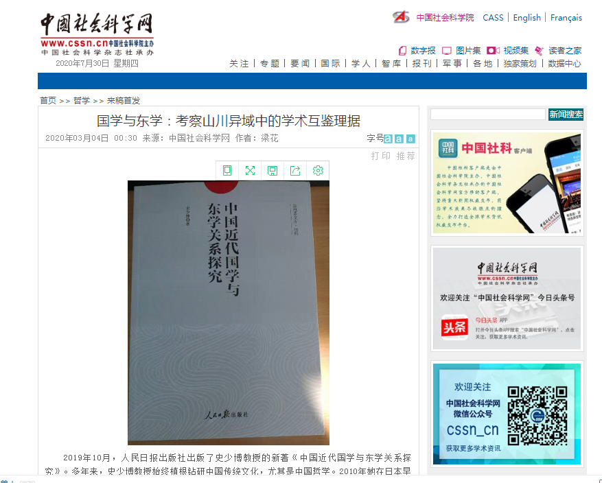 梁花博士所撰《国学与东学:考察山川异域中的学术互鉴理据》一文2020年3月4日发表在中国社会科学网,该文章对于国学与东学进行了考辩,分析中华文化对日本学术的影响,尤其是儒学对“东学”的影响始终存在。这种不对称的文化影响一直持续到近代才发生改变。而中国近代“国学”的产生,也不可避免地有其“东学”渊源。