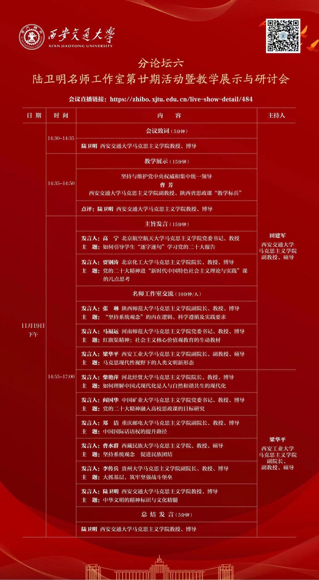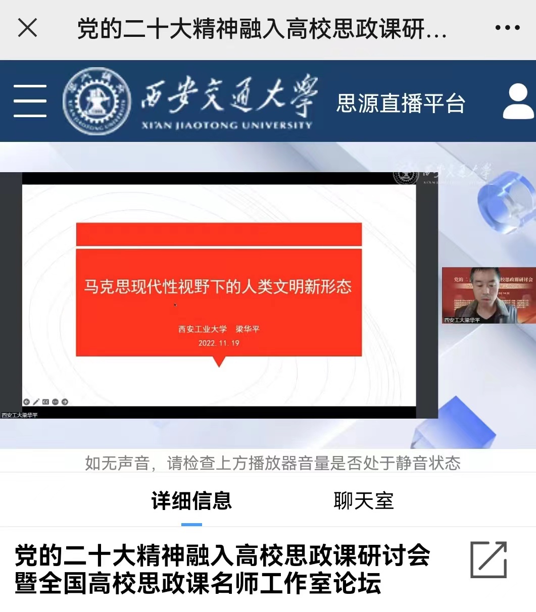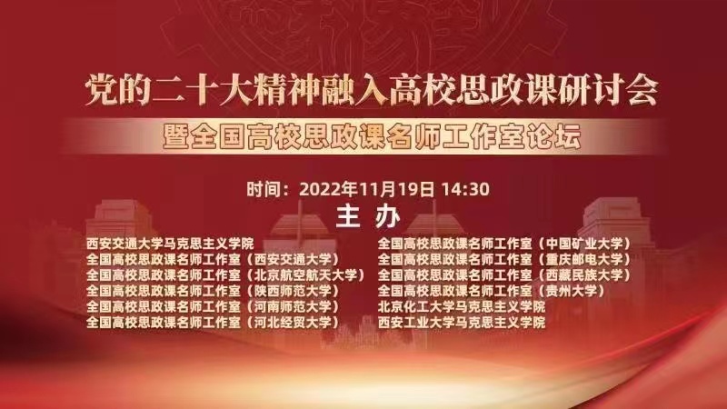 、全国高校思政课名师工作室(西安交通大学等)共同主办的党的二十大精神融入高校思政课研讨会暨全国高校思政课名师工作室论坛成功举办。来自西安交通大学、北京航空航天大学、北京化工大学、陕西师范大学、河南师范大学、西安工业大学、河北经贸大学、中国矿业大学、重庆邮电大学、西藏民族大学、贵州大学等11所高校的12位专家学者做了精彩发言。本次研讨会通过腾讯会议和交大思源直播平台直播,来自全国各地超过8000余名师生在线参加会议或收看直播。