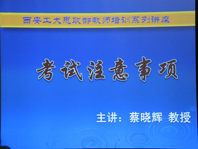 为了强化思政部全体教师教书育人观念,进一步提高全体教师尤其是青年教师的教学能力和技巧,思政部特举办教师培训系列讲座,邀请富有经验的教授为广大师生具体讲解。2011年12月12日,思政部教师授课培训系列讲座第三讲在我校未央校区思政部会议室举行,思政部蔡晓辉副教授主讲“考试注意事项”。
