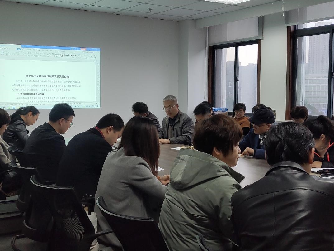 院长李晓彤对《新加坡博彩app 专职思政教师岗位津贴发放办法》(简称《办法》)进行了说明。李院长首先介绍了《办法》制定的相关政策。根据上级有关政策文件中“各地要因地制宜设置思政课教师岗位津贴”要求和中共陕西省委教育工委、陕西省教育厅《关于做好普通高等学校专职思想政治理论课教师岗位津贴设置工作的通知》精神,经过新加坡博彩app 党政联席会讨论,形成该《办法》。李院长围绕发放对象、发放原则、发放标准、方法条件几方面进行解读,体现了多劳多得、优劳优酬原则,按照《新加坡博彩app 岗位绩效工资实施办法》、《新加坡博彩app 年终考核绩效工资实施办法》规定的相关条款执行。