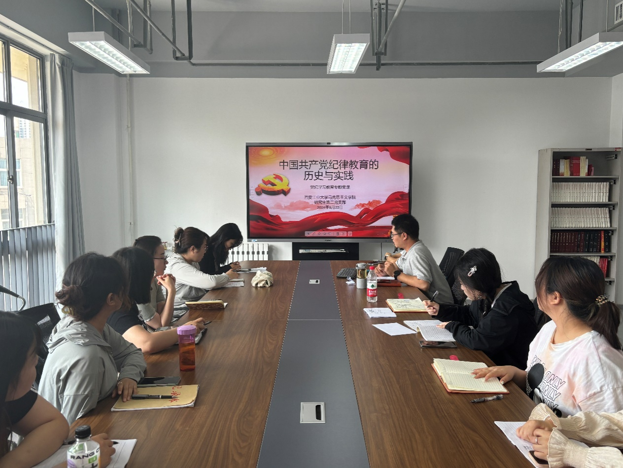 研究生第二党支部于教7楼502党建活动室开展“支部书记讲纪律党课”活动。支部书记刘鲲向与会党员讲授了一堂题为“中国共产党纪律教育的历史与实践”的党课。