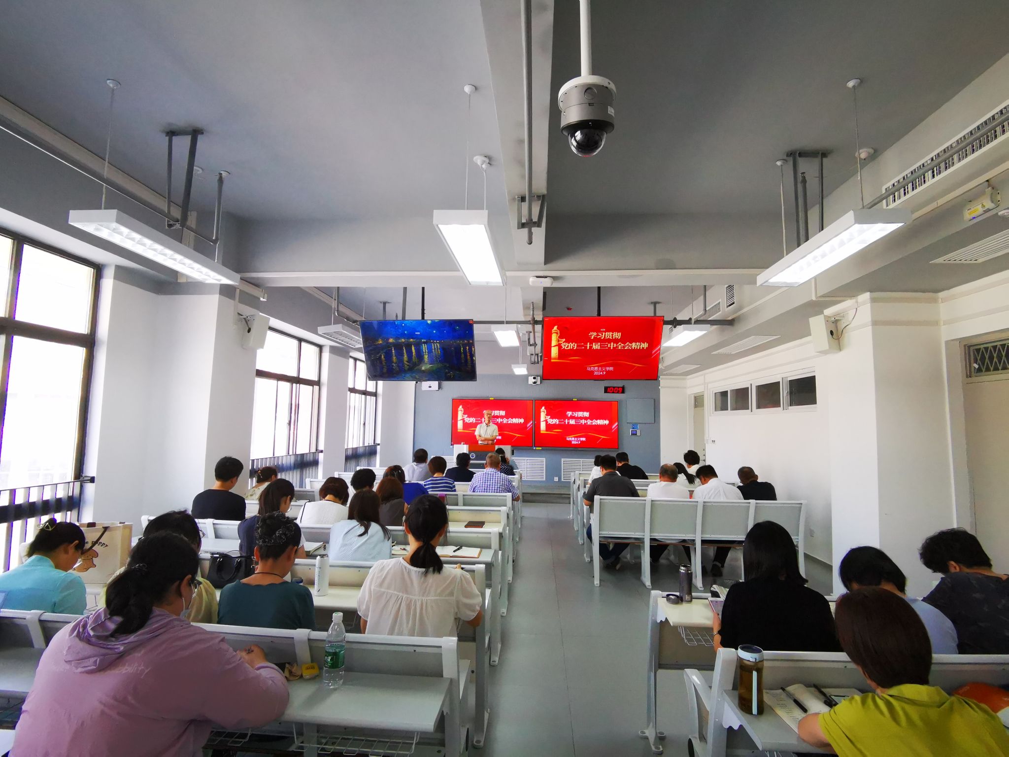 在教七楼305教室召开学习会,集体学习党的二十届三中全会精神。会议由党委书记杨灏主持。