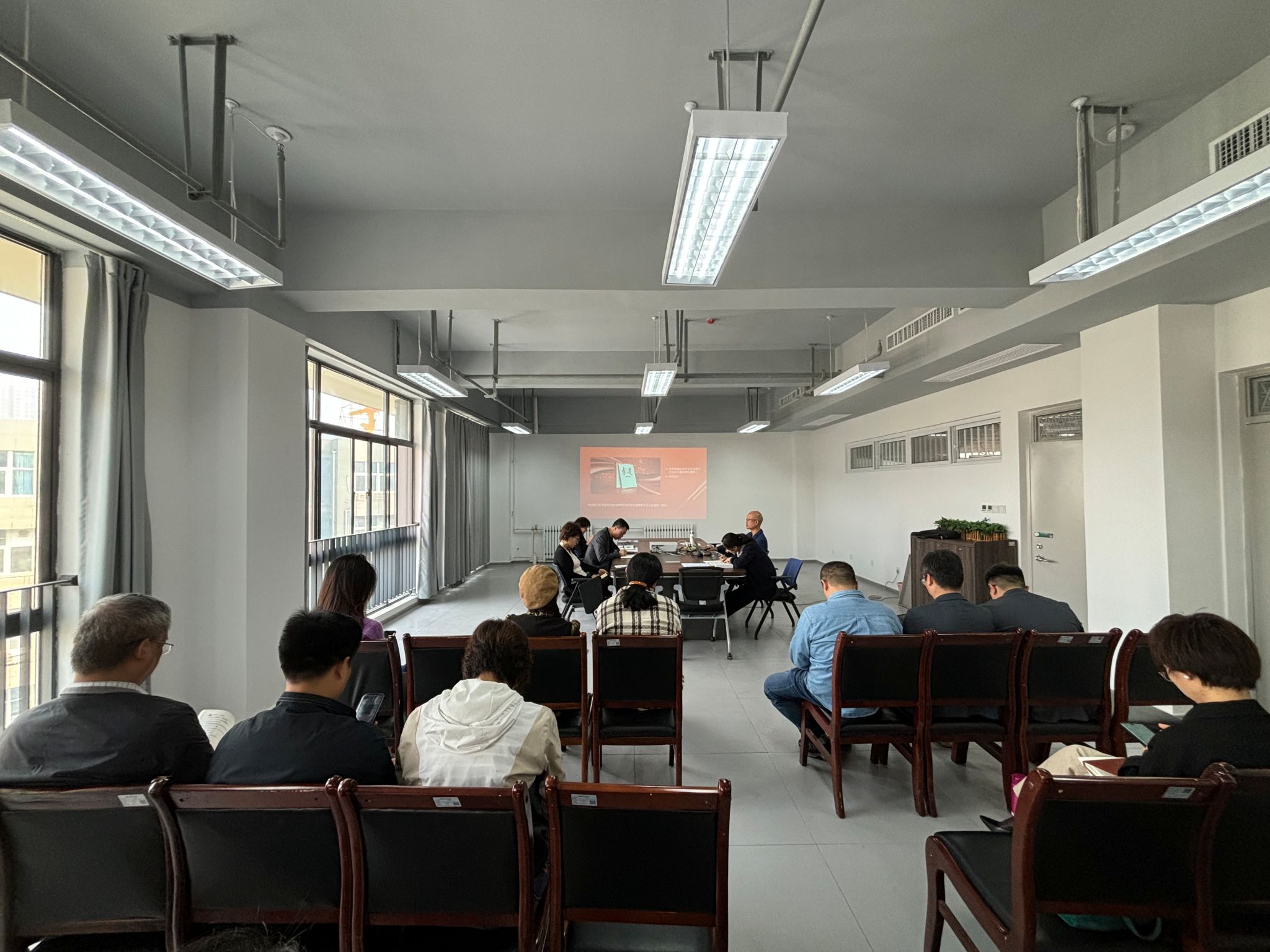 在教七楼503室召开教职工大会,进行集体学习。学习会由党委书记杨灏主持。