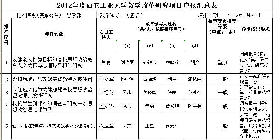 为进一步推进我校高等教育教学改革与质量工程顺利实施,加强高等教育质量内涵建设,深化教育教学改革,推进教育创新,培育高等教育教学成果,提高人才培养质量,提升我校高等教育的综合实力,经研究,学校决定开展2012年教学改革研究项目立项建设工作。思政部按照学校文件要求积极动员,共申报项目5项,其中重点项目一项、一般项目4项。