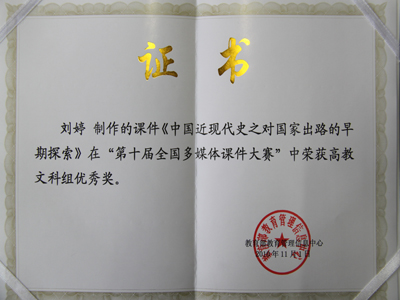 在10月29日至11月1日教育部举办的第十届全国多媒体课件大赛中,西安工业大学思政部刘婷老师的《中国近现代史纲要之对国家出路的早期探索》多媒体课件,喜获优秀奖。