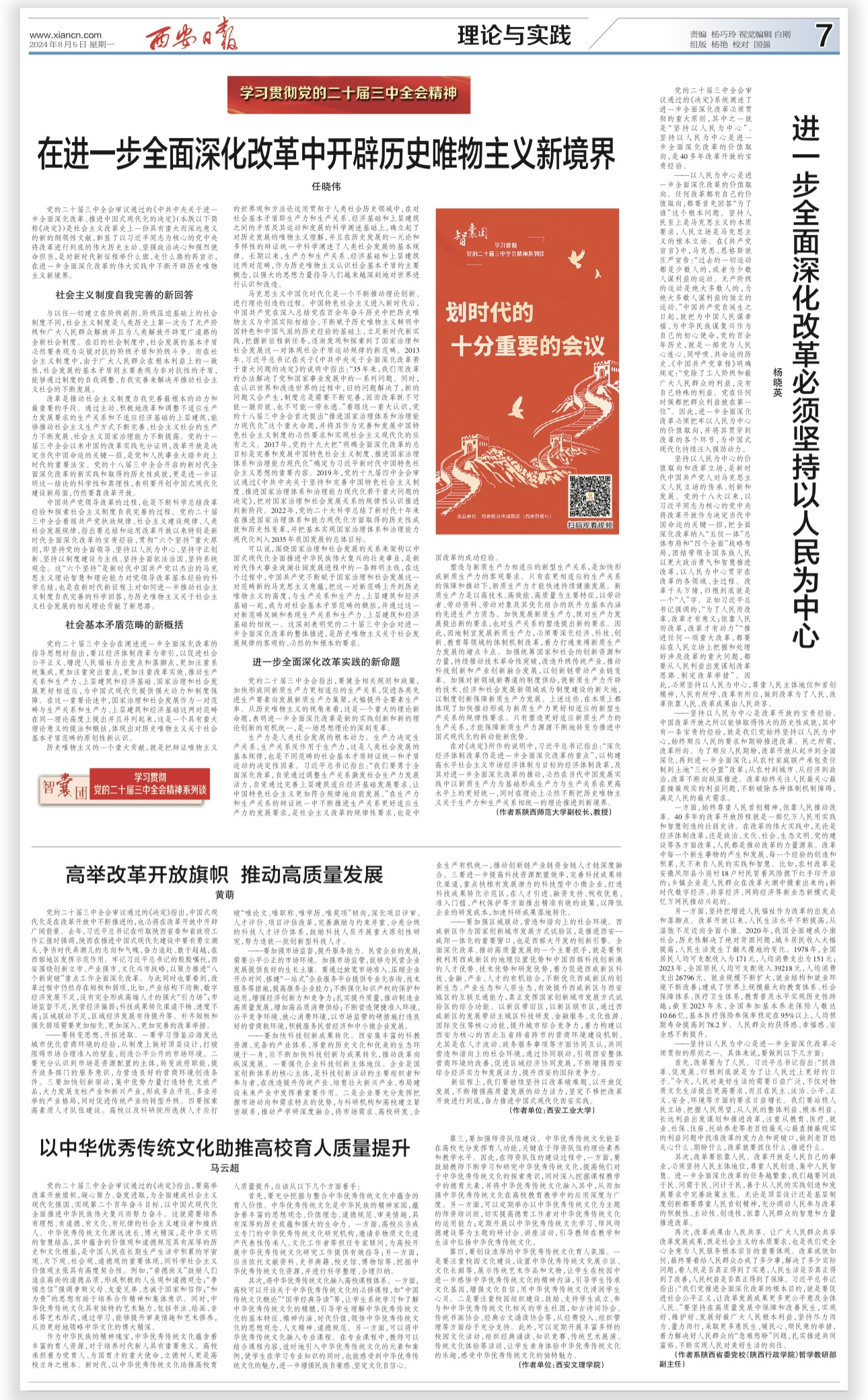 寇瑶副教授文章《坚持以人民为中心推进改革》指出新时代全面深化改革的壮阔历程中,最浓墨重彩的一笔是紧紧依靠人民推动改革,进一步全面深化改革必须坚持以人民为中心。李山峰博士文章《“两个结合”是推进中国式现代化必由之路》指出党的二十届三中全会研究了进一步全面深化改革、推动中国式现代化的问题,指出中国特色的关键在于“两个结合”、“两个结合”是实现中国式现代化的必由之路。黄萌博士、窦欢博士等也分别从不同角度撰文阐释宣传三中全会党的最新理论成果。
