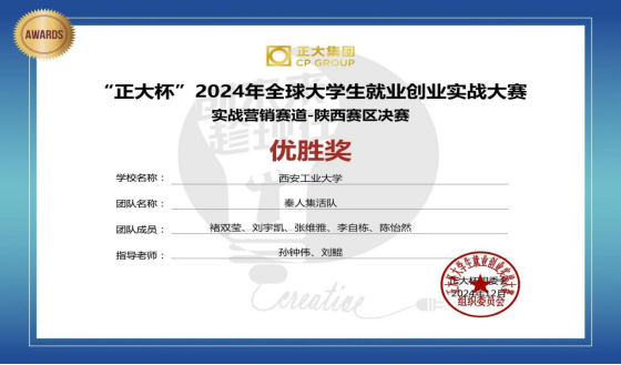 孙钟伟副教授、刘鲲讲师指导,2023级、2024级研究生刘宇凯、褚双莹、李自栋等完成的作品《秦韵茶香-新式养生茶饮品》经过省赛的层层选拔,最终荣获2024年正大杯全球大学生就业创业实战大赛陕西赛区决赛优胜奖。