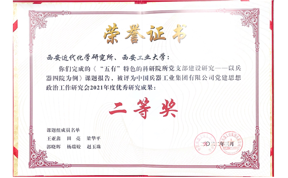 由西安近代化学研究所作为牵头单位,联合西安工业大学共同完成的课题《“五有”特色的科研院所党支部建设研究以兵器四院为例》荣获中国兵器工业集团有限公司党建思想政治工作研究会2021年度优秀研究成果二等奖。课题由新加坡博彩网站 梁华平副教授(唯一执笔人)执笔完成。课题研究过程中,对西安近代化学研究所的392普通党员及党员领导干部进行了调研。结合调研情况,课题主要从新时代加强科研院所党支部建设的重要意义、新时代加强科研院所党支部建设的逻辑理路、彰显新时代“五有”特色党支部建设的新内涵、彰显新时代“五有”特色的党支部建设新举措及彰显新时代“五有”特色的党支部建设的新成效等五个部分进行了研究。